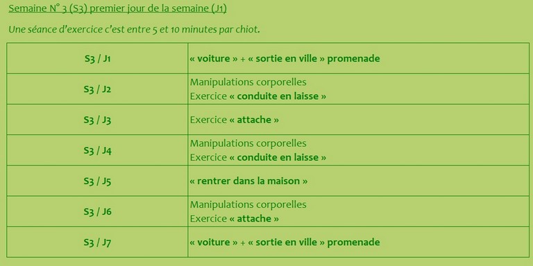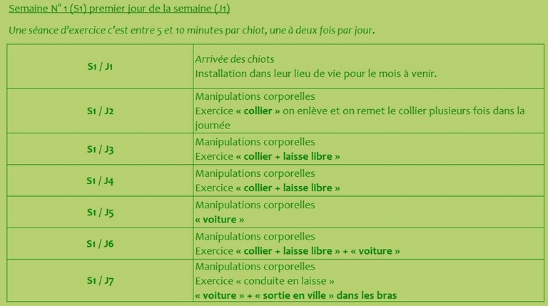 Vous trouverez en ANNEXE de ce texte une proposition de calendrier d’exercices, établi jour par jour, pour les quatre premières semaines suivant l’arrivée des chiots sur votre ferme. Ce calendrier permet de mettre en place une progression dans la complexité des exercices. Il doit être adapté à l’environnement et aux contraintes propres à chaque élevage. Il vous donne une ligne directrice que vous pourrez modifier à votre convenance.