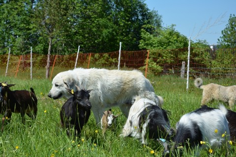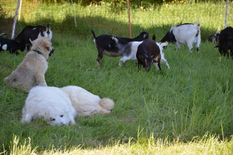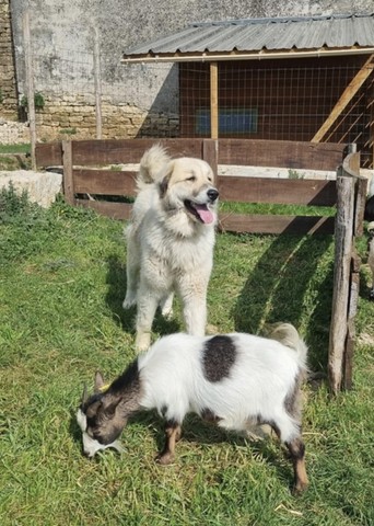 GIULIA du Hogan des Vents [chienne adulte] va super bien et ORGOS du Hogan des Vents [un chiot] aussi. Ils ont tous les deux retrouvés la pâture d'été avec les biquettes. Tout se passe pour le mieux bien qu’ORGOS ait encore un peu de mal avec les chevreaux qui sont très petits (il veut jouer avec eux mais ce n'est pas possible). Nous travaillons dessus et je remarque une nette amélioration. Ce sont des amours de gros nounours. Ils sont tous les deux doux et affectueux. C'est un bonheur de les avoir avec nous. De plus ce sont de très bons gardiens ! Personne ne rentre dans leur parc sans y avoir été invité.