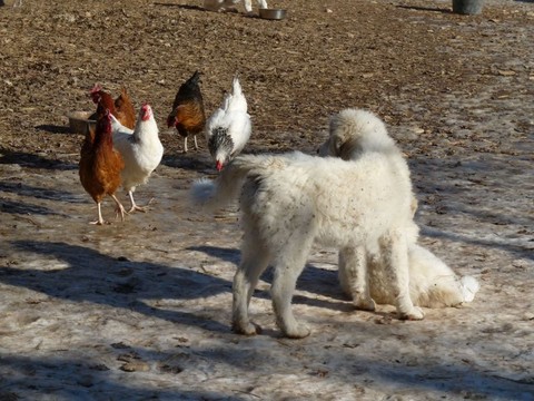 Les chiens – ici un Berger des Carpathes, chien de protection roumain – doivent apprendre à respecter les volailles, c’est un réel apprentissage avec des mises en présence sous contrôle de l’éleveur pendant les deux premières années.
